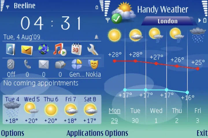 Nếu cảm thấy nhàm chán với màn hình chờ đơn điệu của điện thoại thì đã đến lúc bạn nên thử qua ứng dụng Handy Shell. Ứng dụng này sẽ “biến tấu” lại toàn bộ giao diện màn hình chờ của máy, ngoài các đường dẫn mở nhanh các ứng dụng ra, Handy Shell còn bổ sung thêm các thông tin cần thiết khác như số tin nhắn mới, số cuộc gọi nhỡ, các cuộc hẹn sắp tới và hiển thị cả thông tin thời tiết trong nhiều ngày nếu bạn có cài ứng dụng Handy Weather.