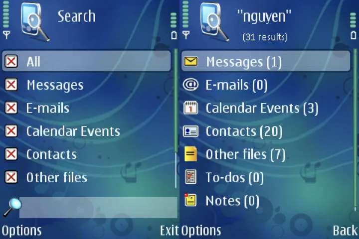 Search có thể tìm kiếm gần như toàn bộ các dữ liệu có trong điện thoại. Từ danh bạ, tin nhắn, lịch hẹn cho đến e-mail, lịch làm việc, ghi chú và các tập tin dữ liệu khác. Chương trình nhỏ gọn này có tốc độ làm việc khá nhanh, kết quả tìm kiếm rất tốt và chính xác. Kết quả tìm kiếm sẽ được phân thành từng mục khác nhau để bạn dễ lựa chọn.