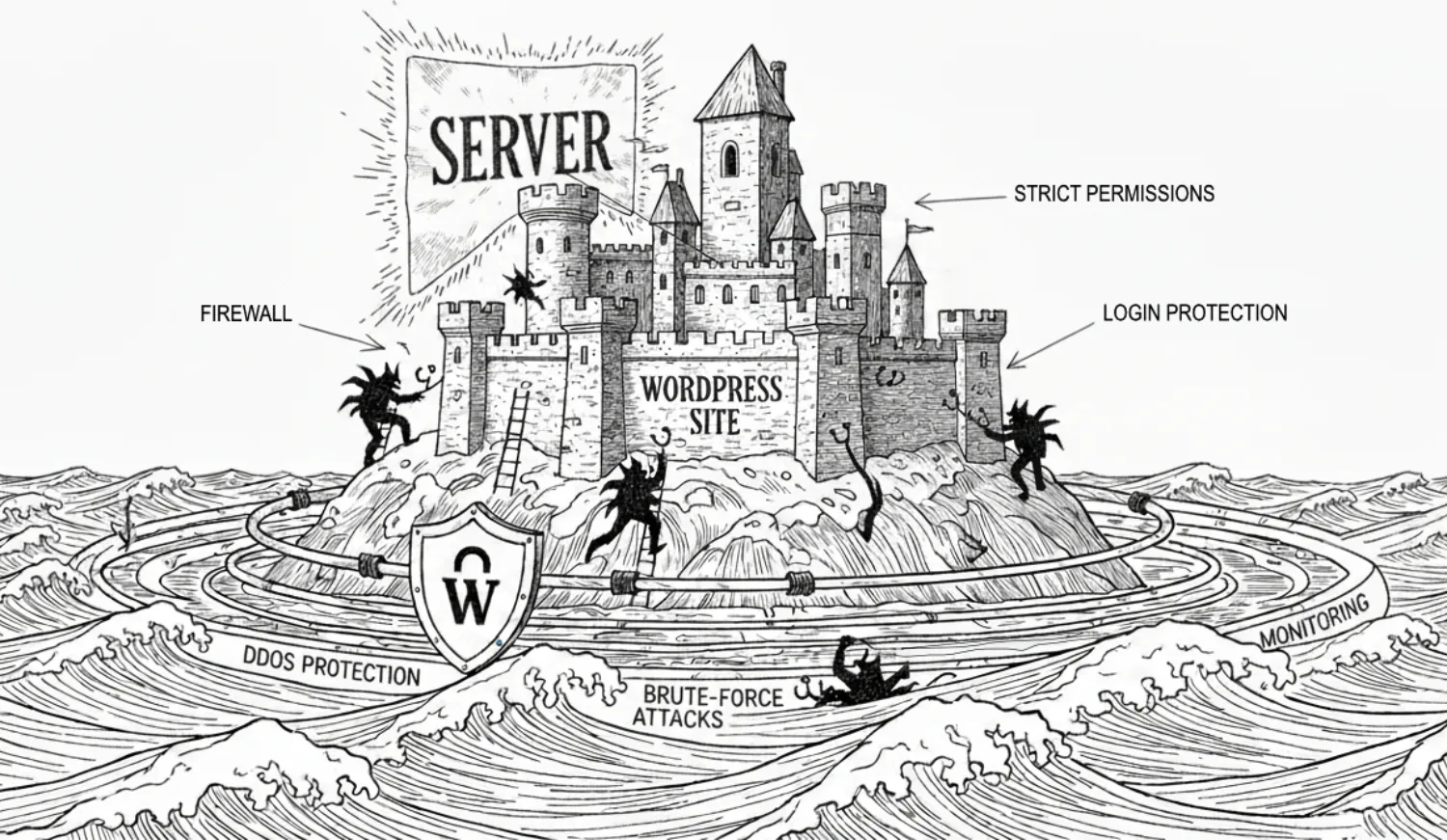 Security starts at the infrastructure level. Your server, hosting environment, database, PHP settings, file permissions, SSL, and firewall rules form the base. A misconfigured server can compromise even the most secure WordPress site.
